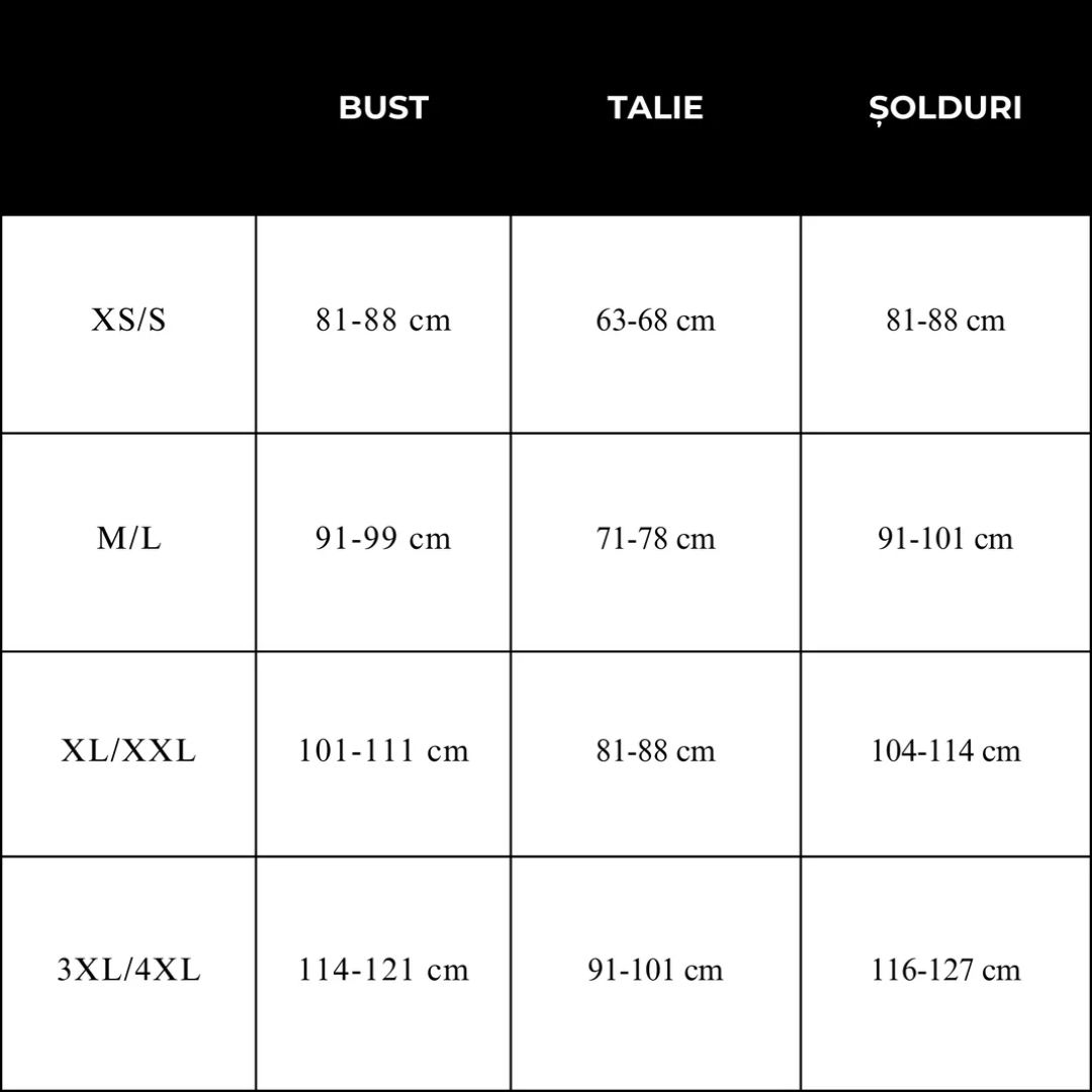 Dacă aveți nevoie de ajutor în alegerea mărimii perfecte, vă rugăm să ne contactați la nr. 0732953387 sau pe chat-ul website-ului.